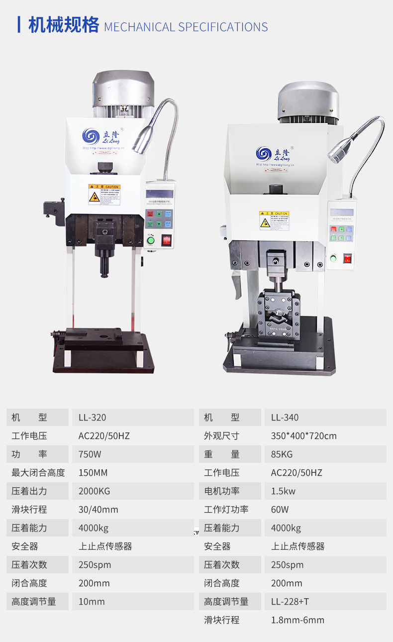 LL-320半自動超靜音端子機   產品說明:   1.采用先進的電子控制,配有高精度進口電磁離合器/制動器,動作敏捷、準確。   2.低噪音、耗電省、送料準、效率高。   3.更寬的高度調節范圍,更高的調節精度,節省壓接高度...